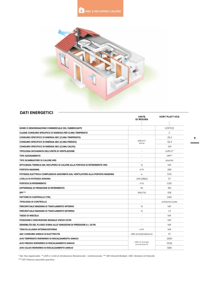 * NA: Non Applicabile. ** UVR-U: Unità di Ventilazione Residenziale - Unidirezionale. *** VM: Velocità Multiple. VSD: Variatore di Velocit