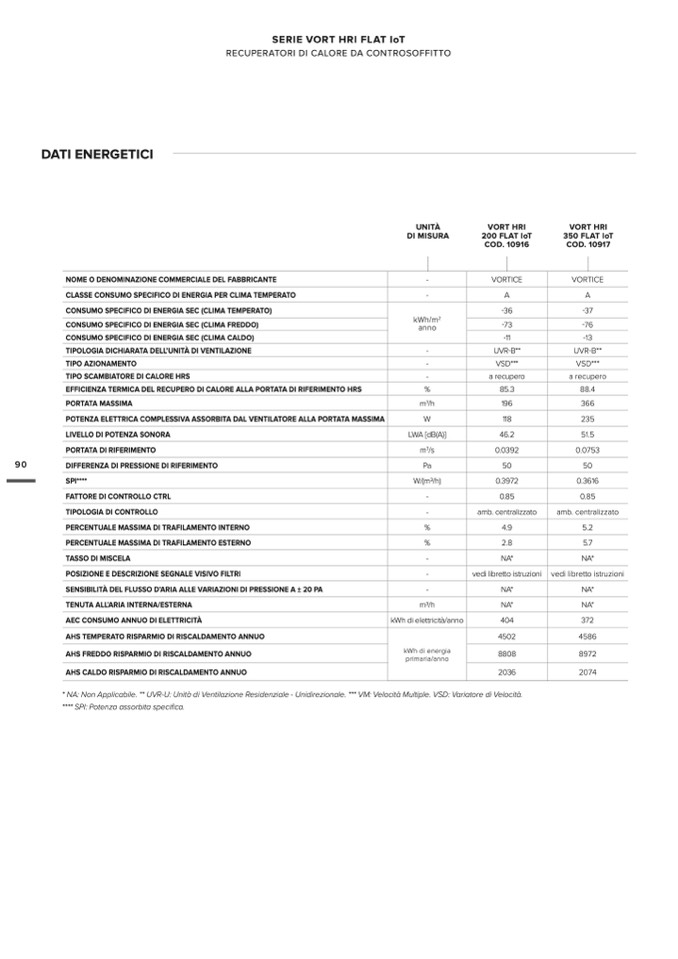 * NA: Non Applicabile. ** UVR-U: Unità di Ventilazione Residenziale - Unidirezionale. *** VM: Velocità Multiple. VSD: Variatore di Velocità.