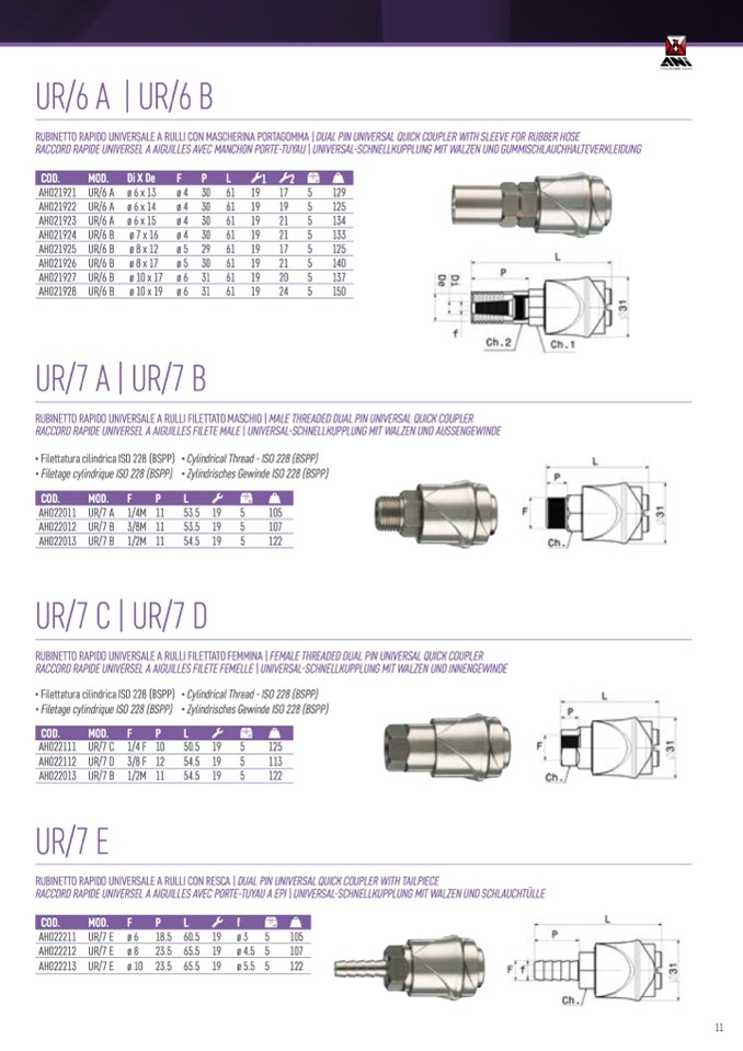 RUBINETTO RAPIDO UNIVERSALE A RULLI CON MASCHERINA PORTAGOMMA | DUAL PIN UNIVERSAL QUICK COUPLER WITH SLEEVE FOR RUBBER HOSE