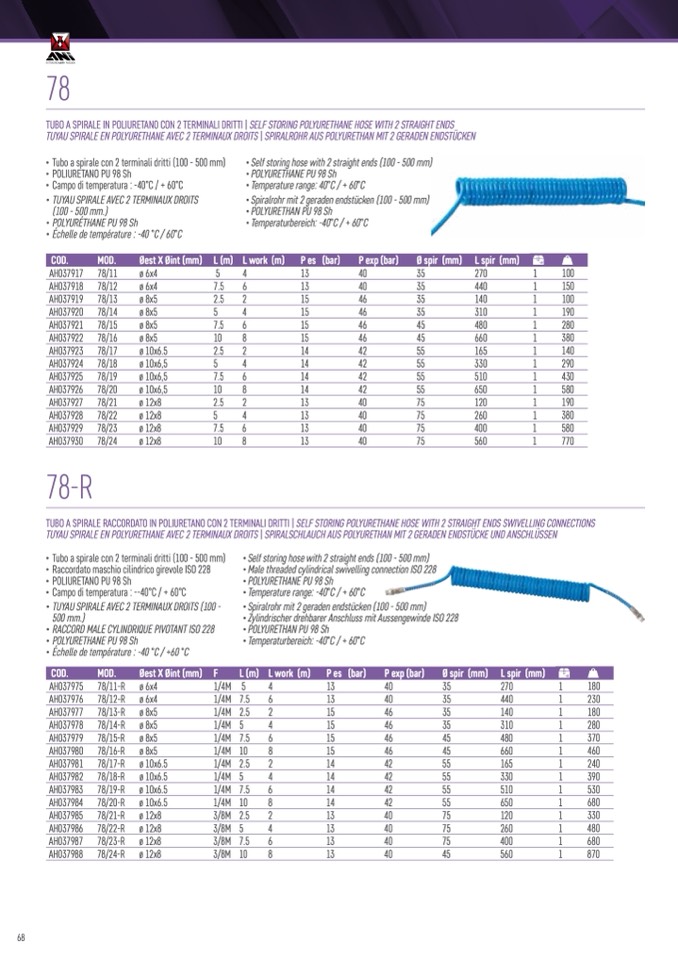 TUBO A SPIRALE RACCORDATO IN POLIURETANO CON 2 TERMINALI DRITTI | SELF STORING POLYURETHANE HOSE WITH 2 STRAIGHT ENDS SWIVELLING CONNECTIONS
