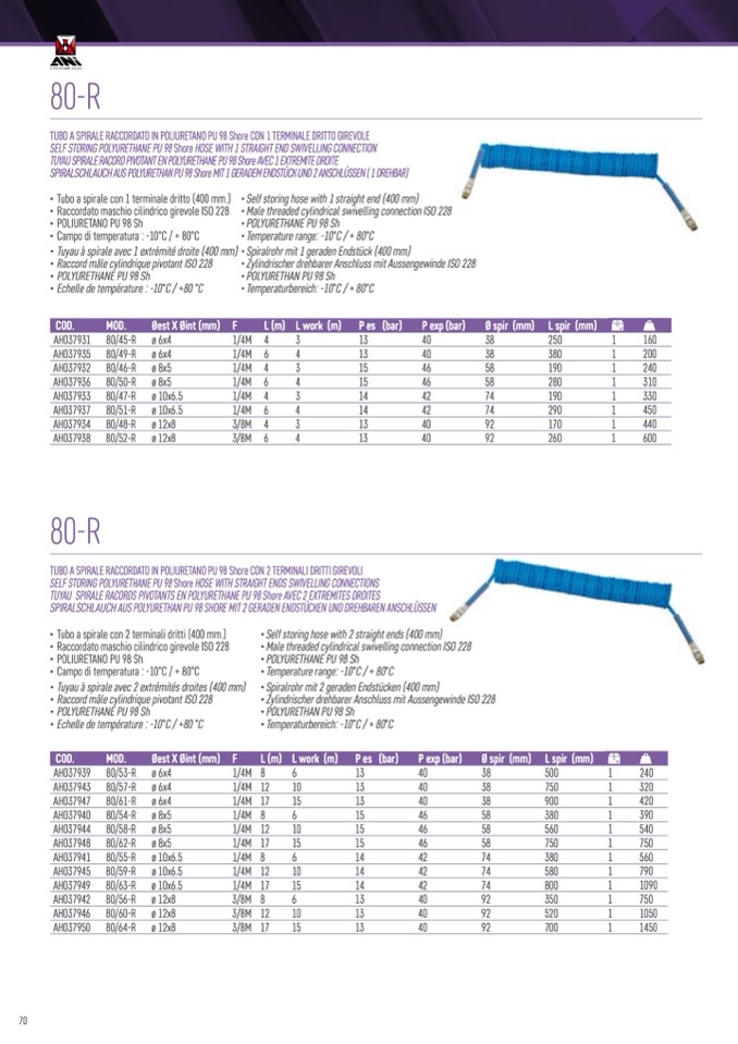 SPIRALSCHLAUCH AUS POLYURETHAN PU 98 SHORE MIT 2 GERADEN ENDSTÜCKEN UND DREHBAREN ANSCHLÜSSEN