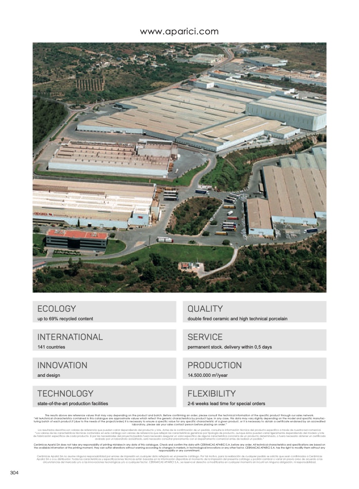 Cerámicas Aparici SA does not take any responsability of printing mistakes in any data of this catalogue. Check and confirm the data with CERÁMICAS APARICI S.A. before any order. All technical characteristics and specifications are based on