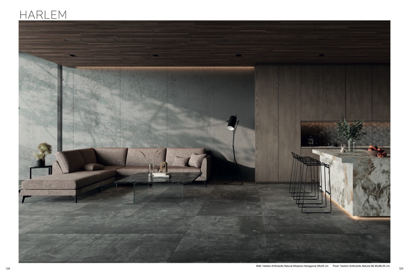 Wall: Harlem Anthracite Natural Mosaico Hexagonal 28x30 cm Floor: Harlem Anthracite Natural 99,55x99,55 cm.
