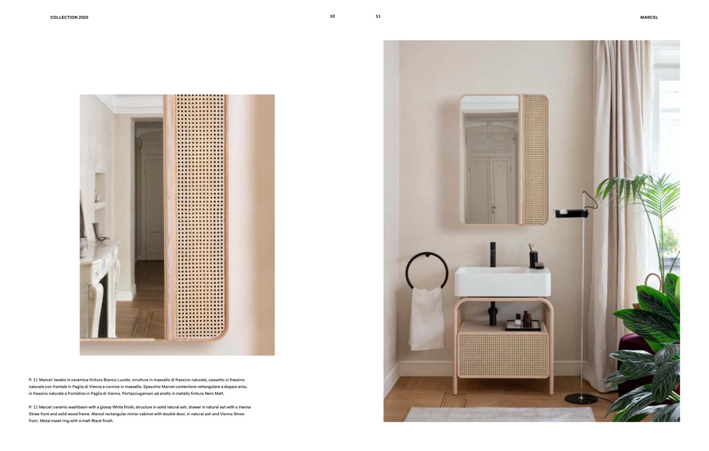 P. 11 Marcel: lavabo in ceramica finitura Bianco Lucido, struttura in massello di frassino naturale, cassetto in frassino