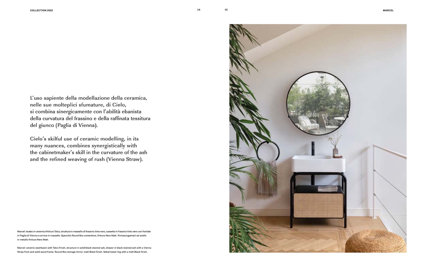 in Paglia di Vienna e cornice in massello. Specchio Round Box contenitore, finitura Nero Matt. Portasciugamani ad anello