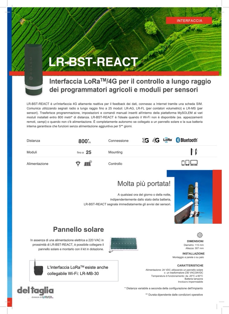 moduli installati entro 800 metri* di distanza. LR-BST-REACT è l'ideale quando il Wi-Fi non è disponibile (es. appezzamenti