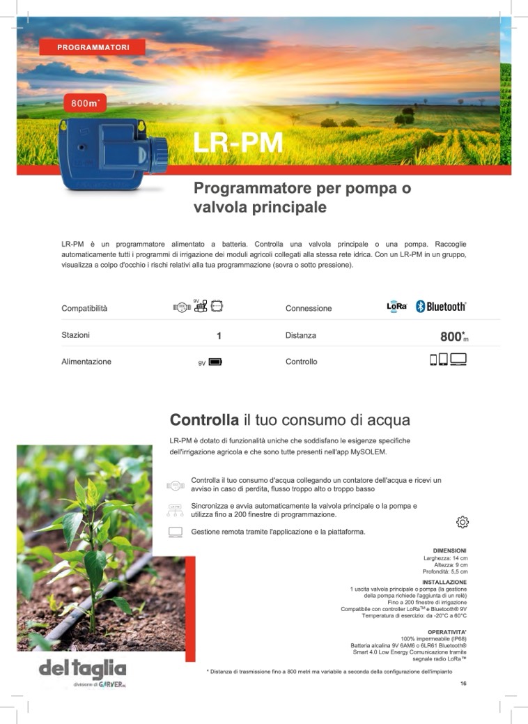LR-PM è un programmatore alimentato a batteria. Controlla una valvola principale o una pompa. Raccoglie