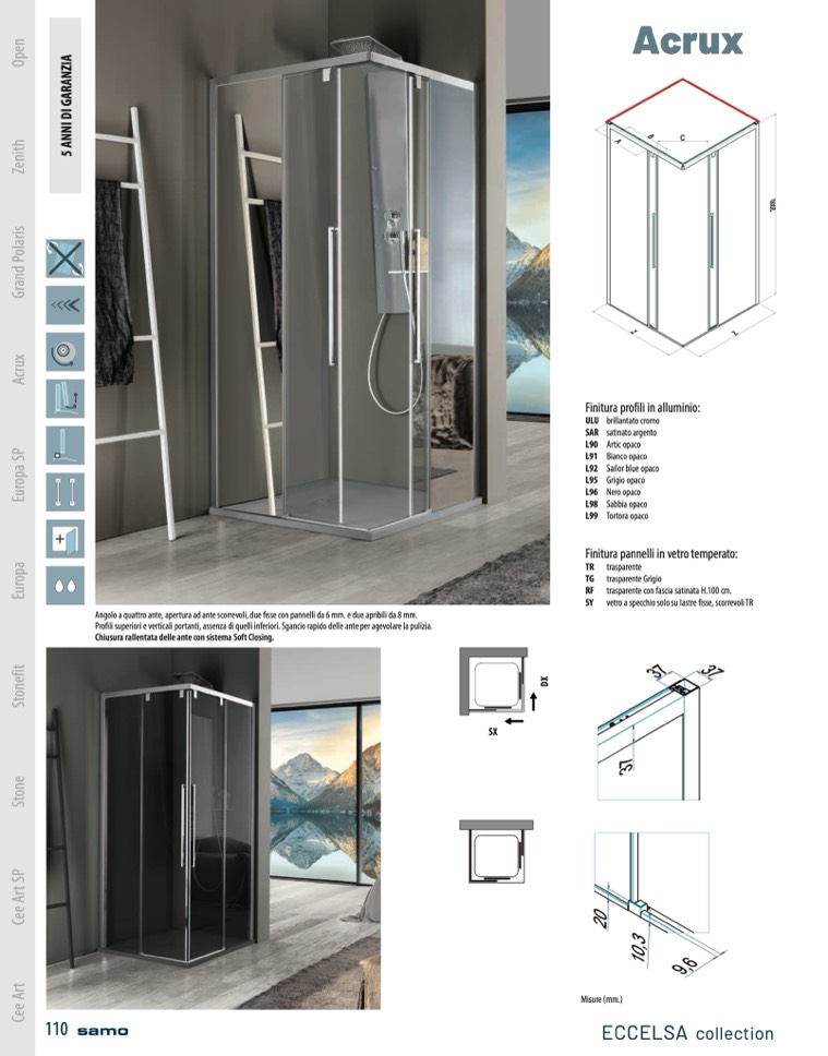 Profili superiori e verticali portanti, assenza di quelli inferiori. Sgancio rapido delle ante per agevolare la pulizia.