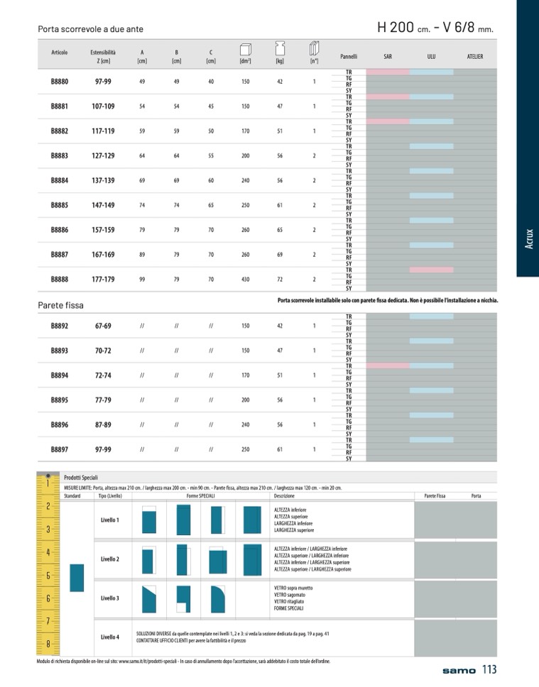 MISURE LIMITE: Porta, altezza max 210 cm. / larghezza max 200 cm. - min 90 cm. - Parete fissa, altezza max 210 cm. / larghezza max 120 cm. - min 20 cm.