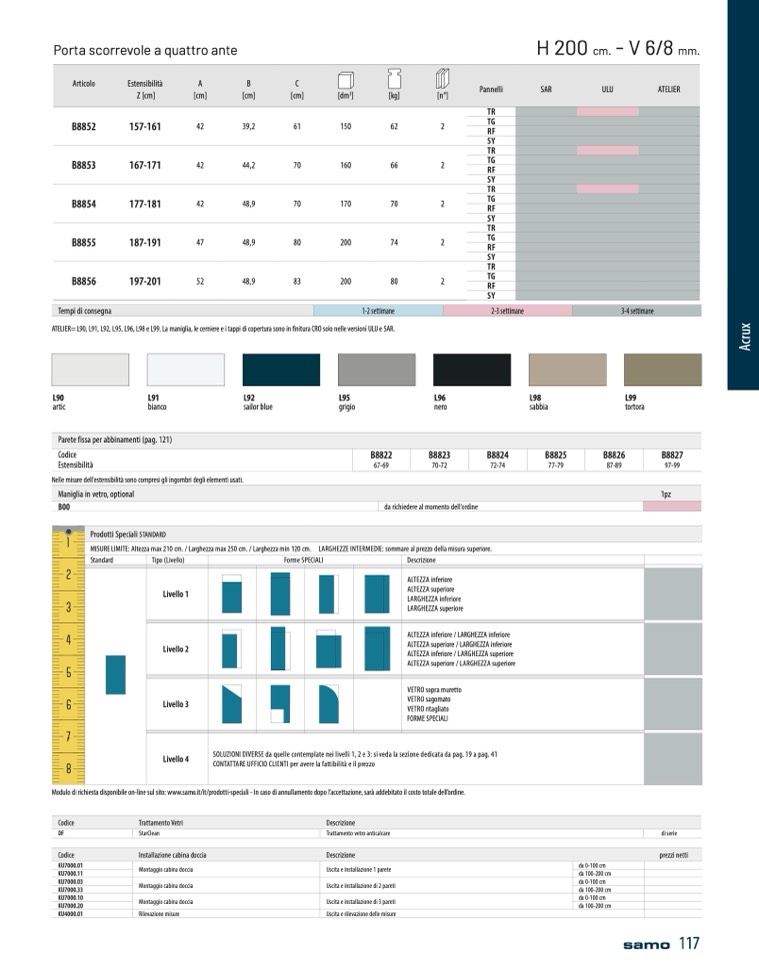 ATELIER= L90, L91, L92, L95, L96, L98 e L99. La maniglia, le cerniere e i tappi di copertura sono in finitura CRO solo nelle versioni ULU e SAR.
