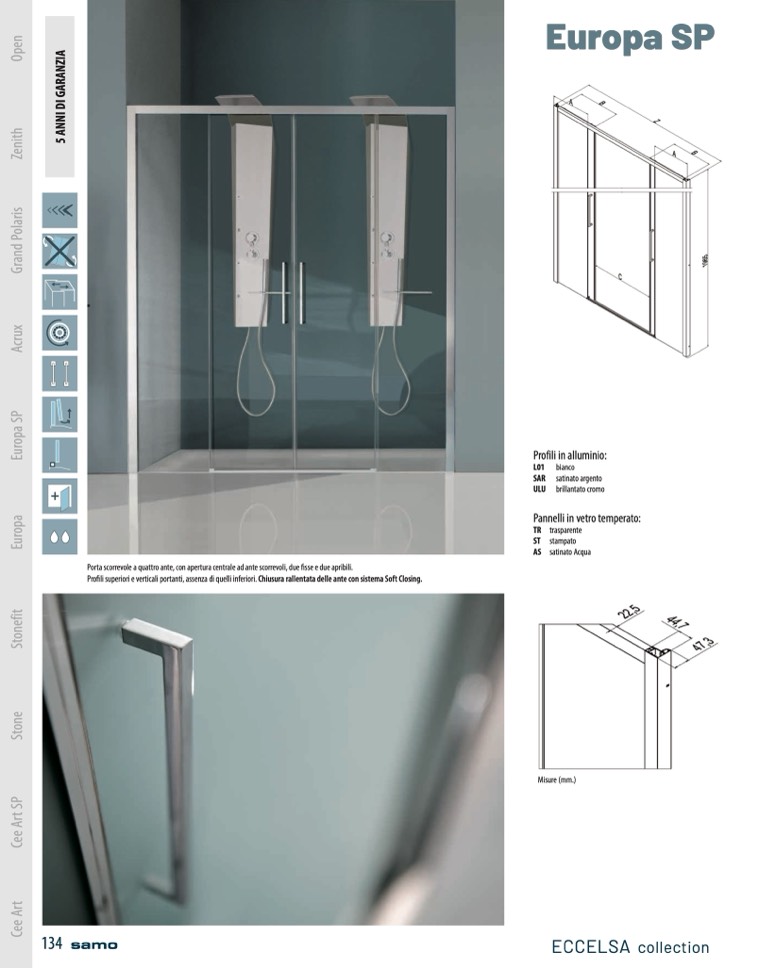 Profili superiori e verticali portanti, assenza di quelli inferiori. Chiusura rallentata delle ante con sistema Soft Closing.
