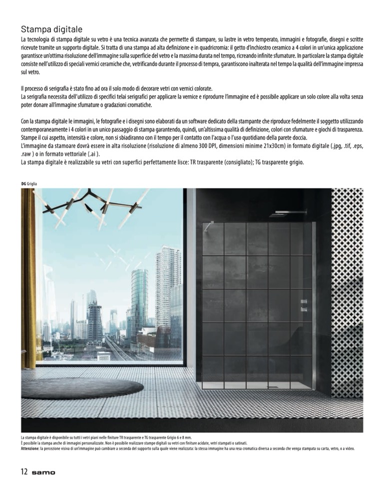 La stampa digitale è realizzabile su vetri con superfici perfettamente lisce: TR trasparente (consigliato); TG trasparente grigio.