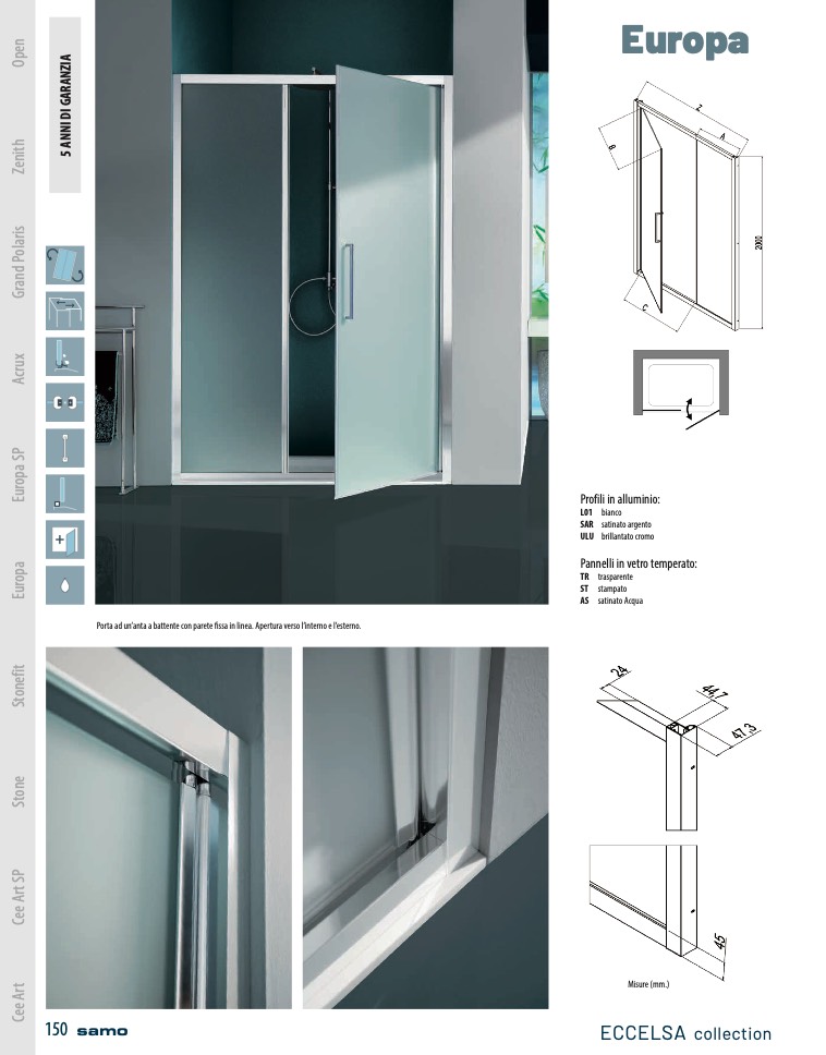 Porta ad un’anta a battente con parete fissa in linea. Apertura verso l’interno e l’esterno.