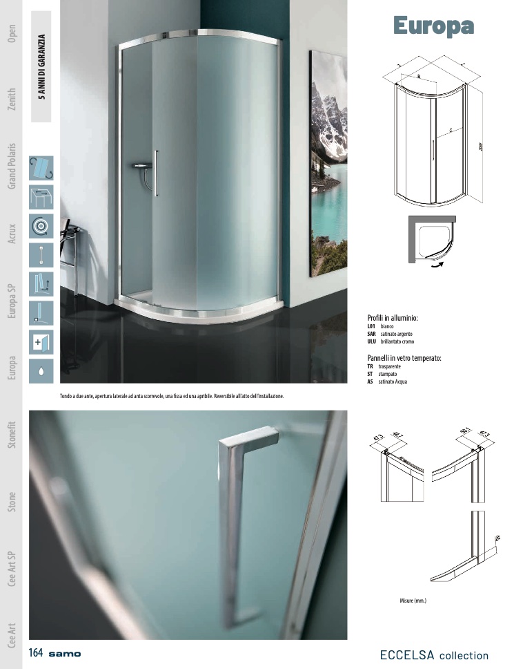 Tondo a due ante, apertura laterale ad anta scorrevole, una fissa ed una apribile. Reversibile all’atto dell’installazione.