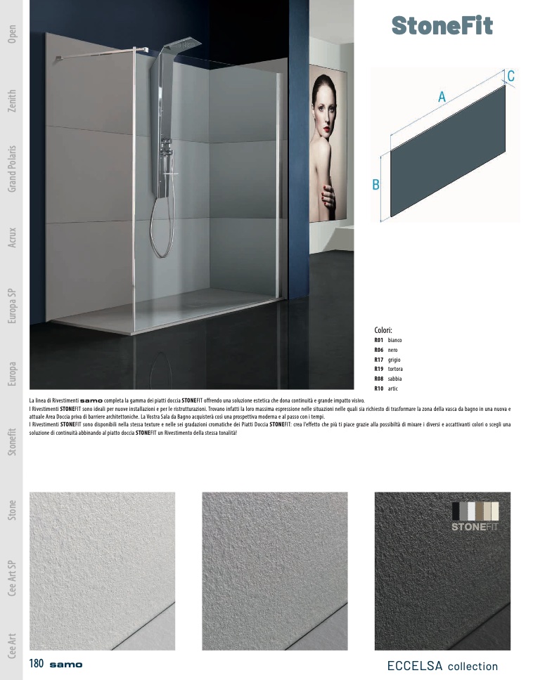 La linea di Rivestimenti samo completa la gamma dei piatti doccia STONEFIT offrendo una soluzione estetica che dona continuità e grande impatto visivo.