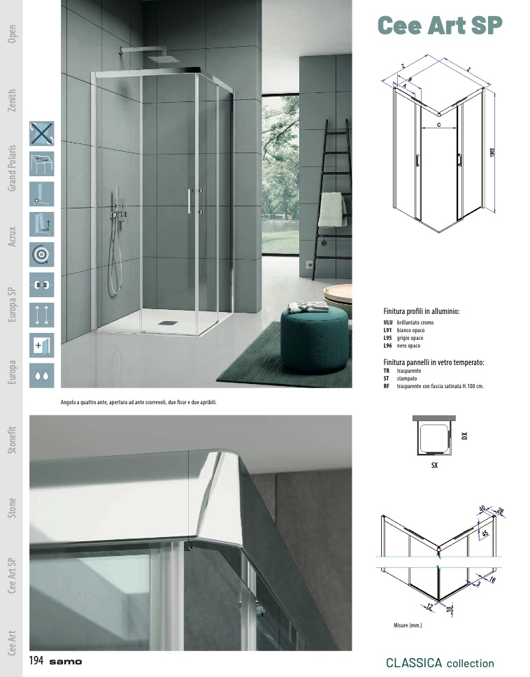 Angolo a quattro ante, apertura ad ante scorrevoli, due fisse e due apribili.
