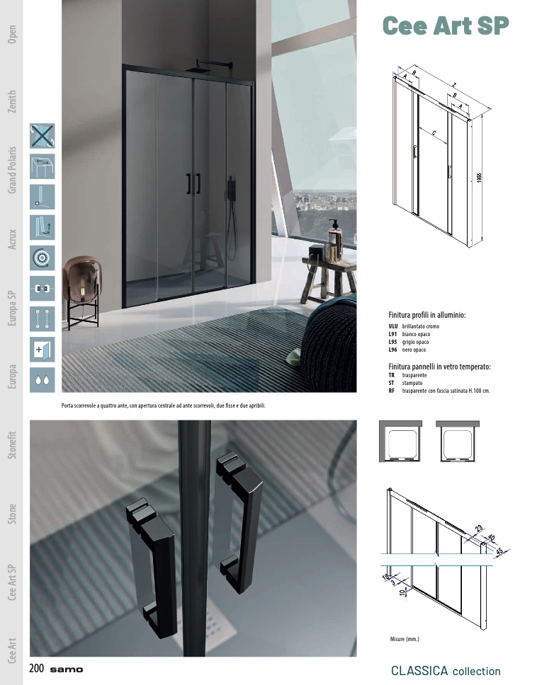 Porta scorrevole a quattro ante, con apertura centrale ad ante scorrevoli, due fisse e due apribili.