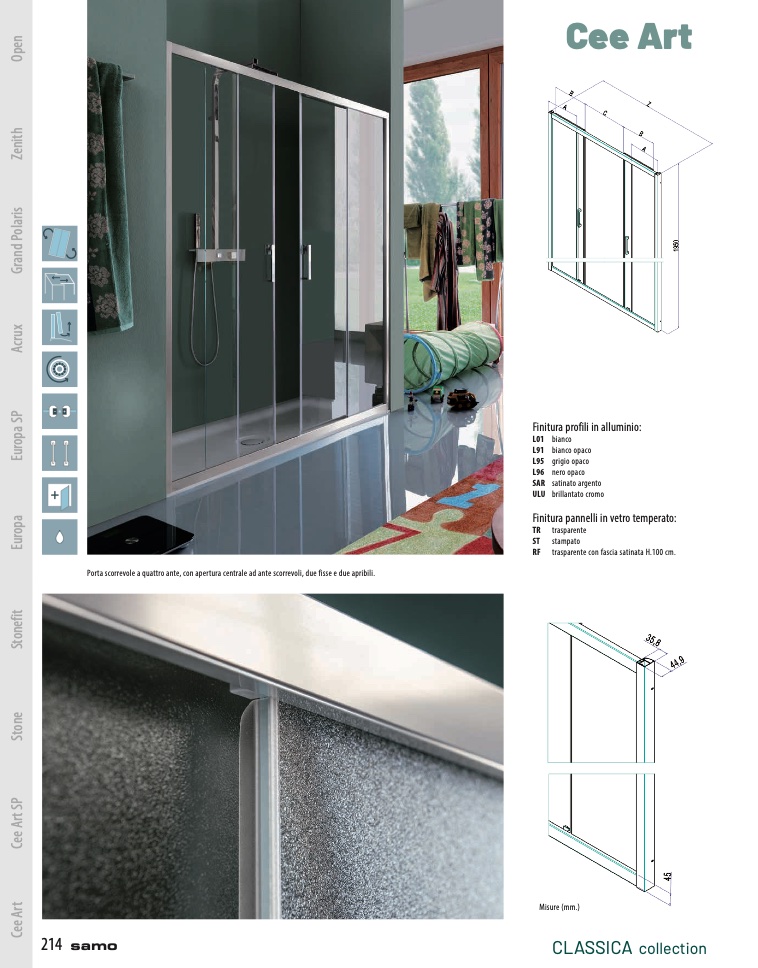Porta scorrevole a quattro ante, con apertura centrale ad ante scorrevoli, due fisse e due apribili.