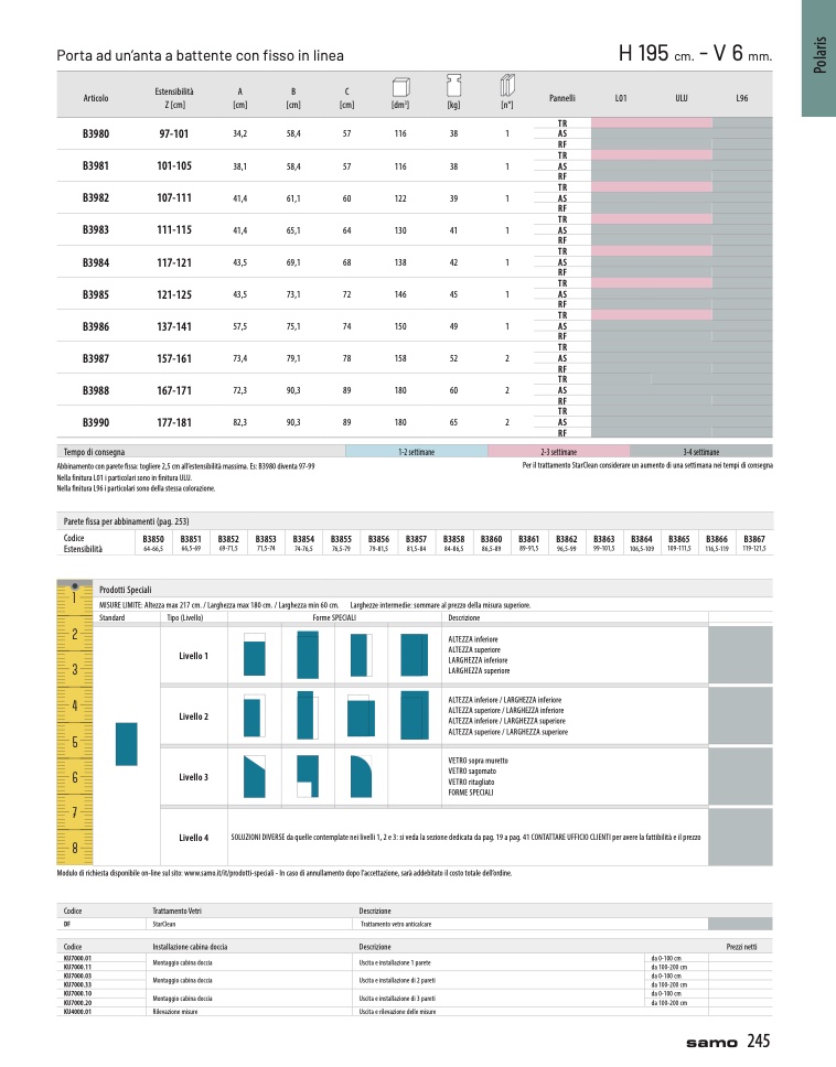Abbinamento con parete fissa: togliere 2,5 cm all’estensibilità massima. Es: B3980 diventa 97-99