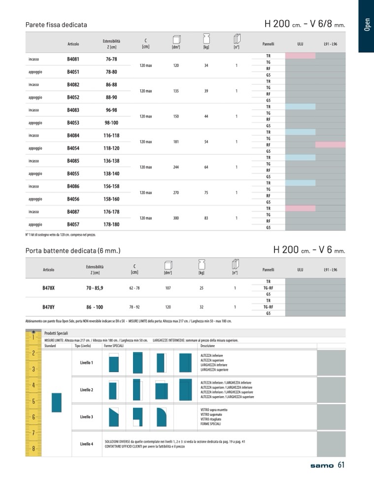Abbinamento con parete fissa Open Side, porta NON reversibile indicare se DX o SX - MISURE LIMITE della porta: Altezza max 217 cm. / Larghezza min 50 - max 100 cm.