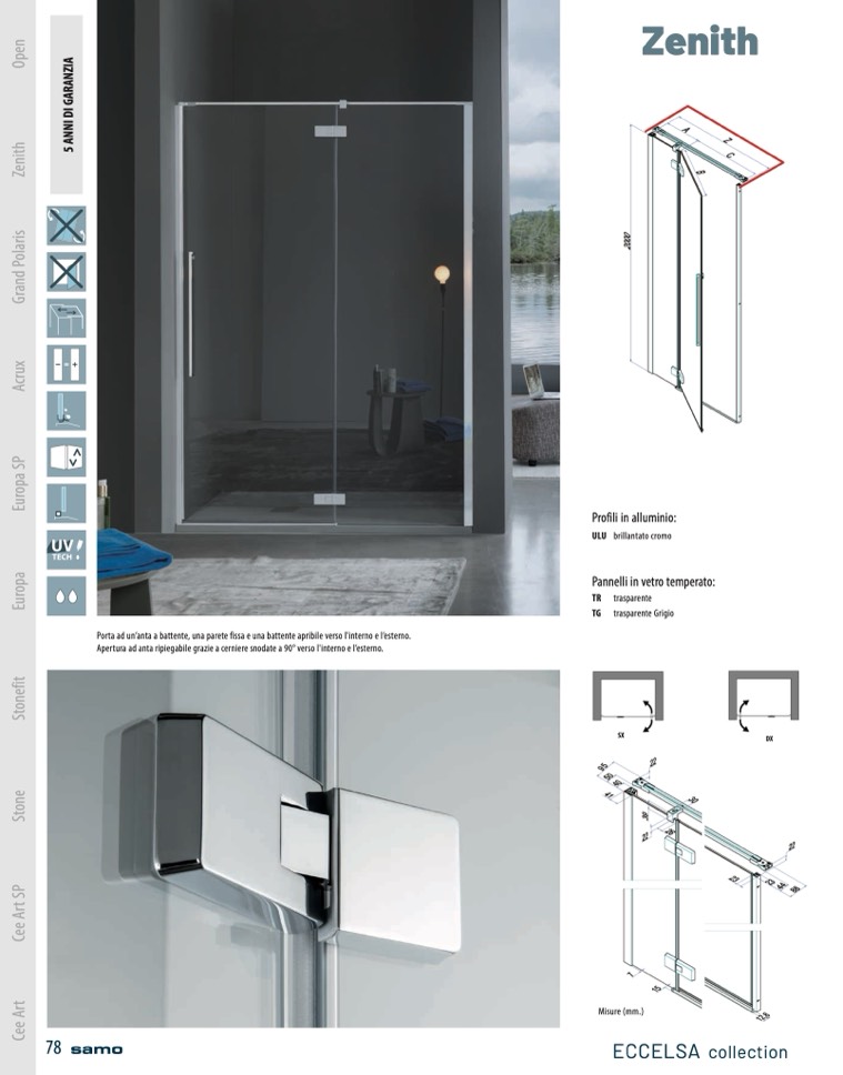 Apertura ad anta ripiegabile grazie a cerniere snodate a 90° verso l'interno e l’esterno.