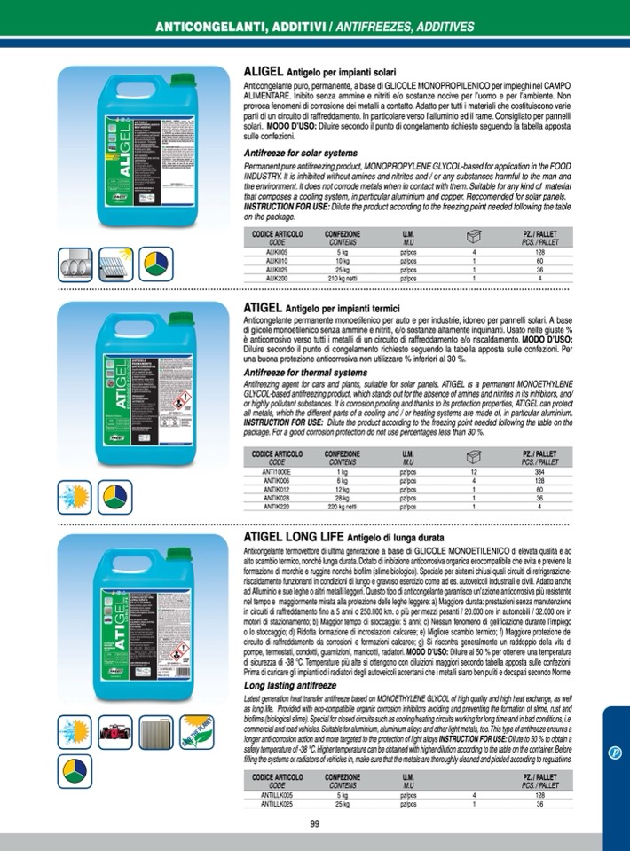 Antifreezing agent for cars and plants, suitable for solar panels. ATIGEL is a permanent MONOETHYLENE