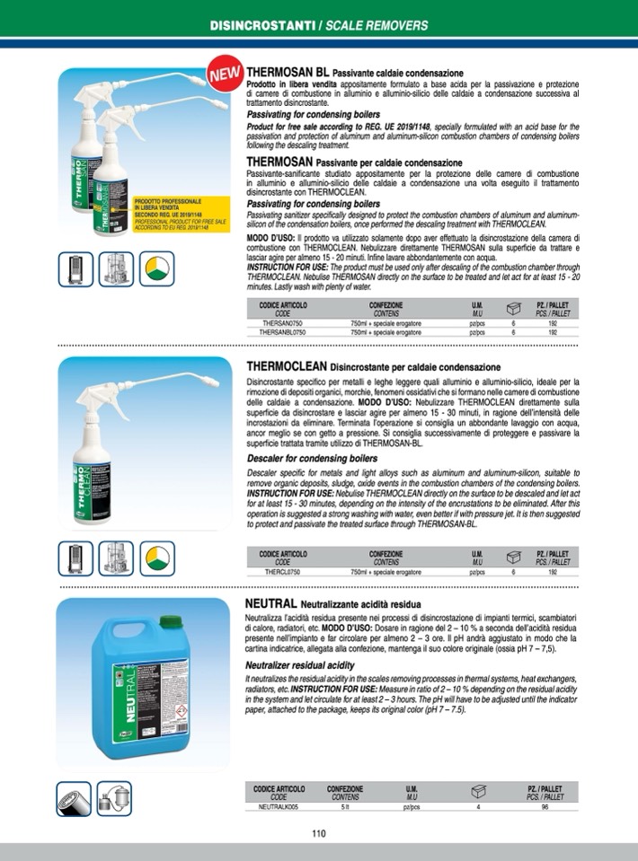 INSTRUCTION FOR USE: The product must be used only after descaling of the combustion chamber through