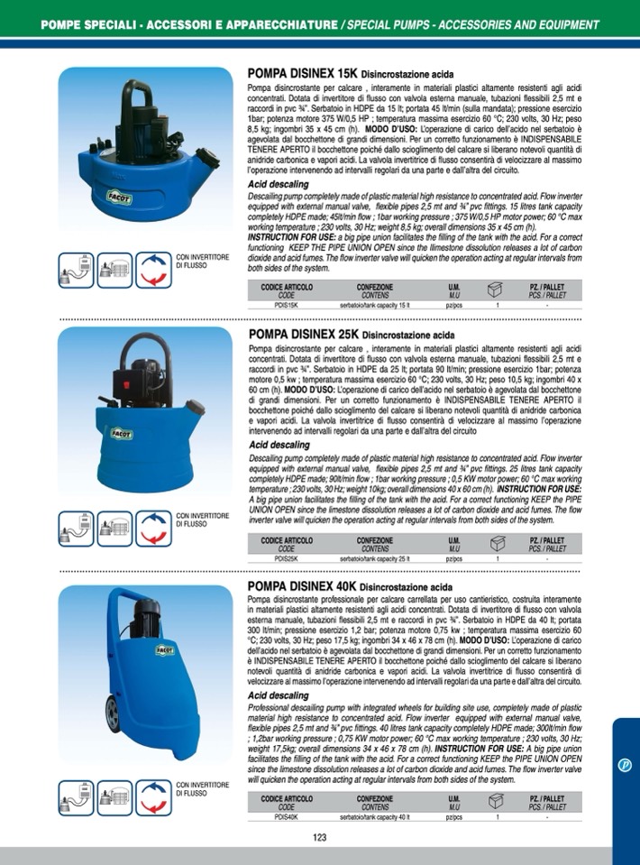 Descailing pump completely made of plastic material high resistance to concentrated acid. Flow inverter