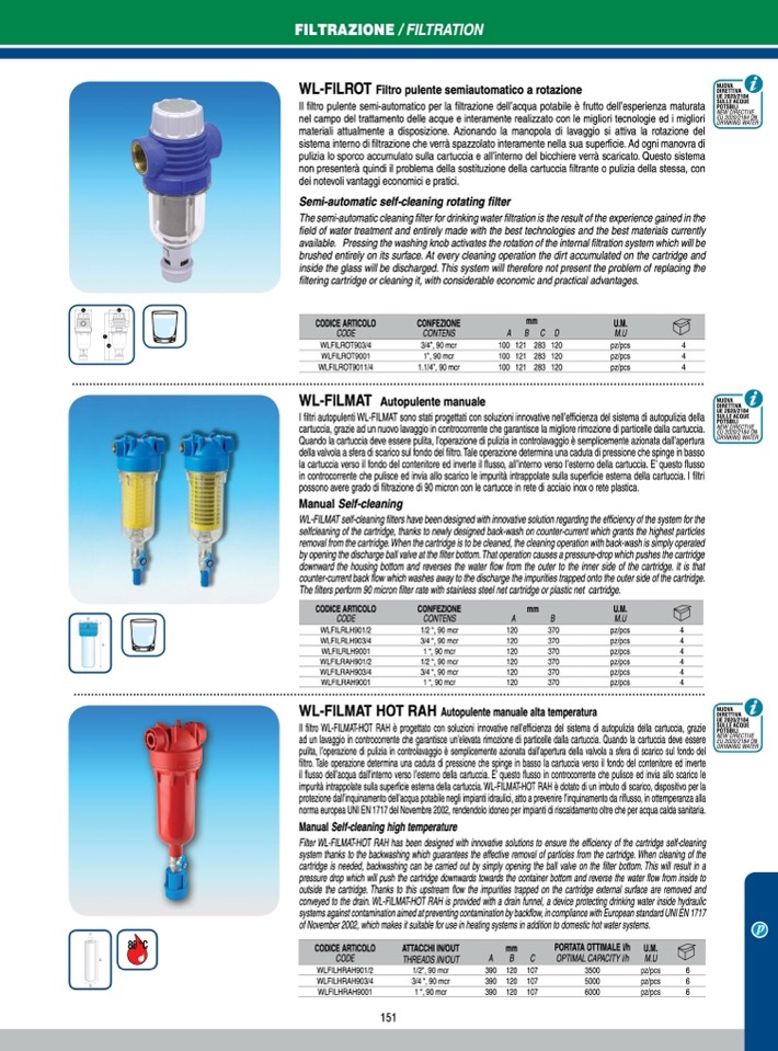possono avere grado di filtrazione di 90 micron con le cartucce in rete di acciaio inox o rete plastica.