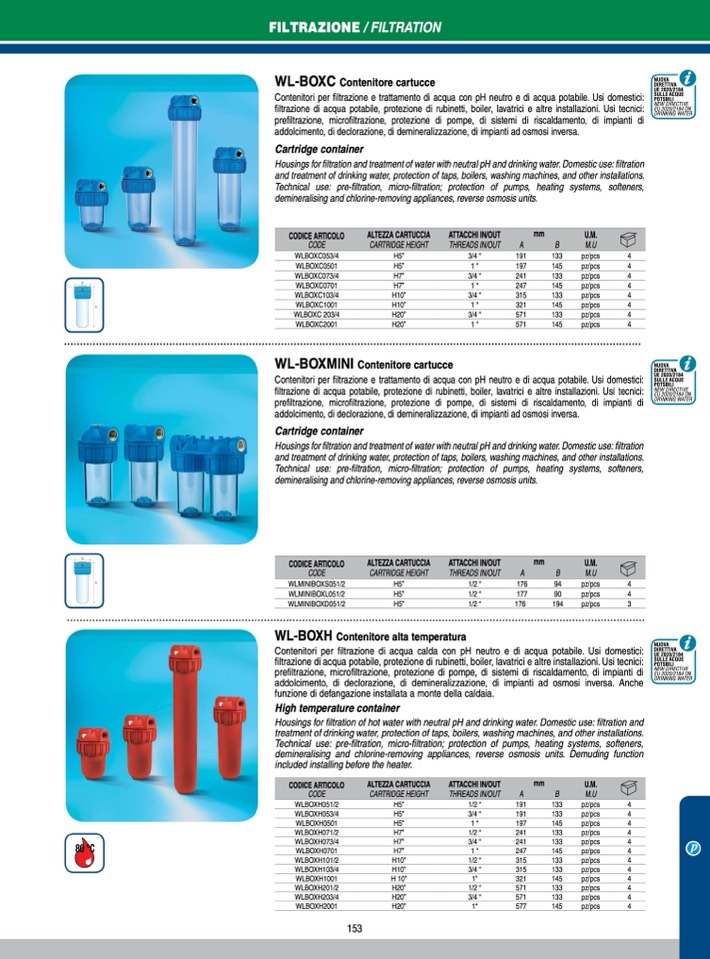 Contenitori per filtrazione di acqua calda con pH neutro e di acqua potabile. usi domestici: