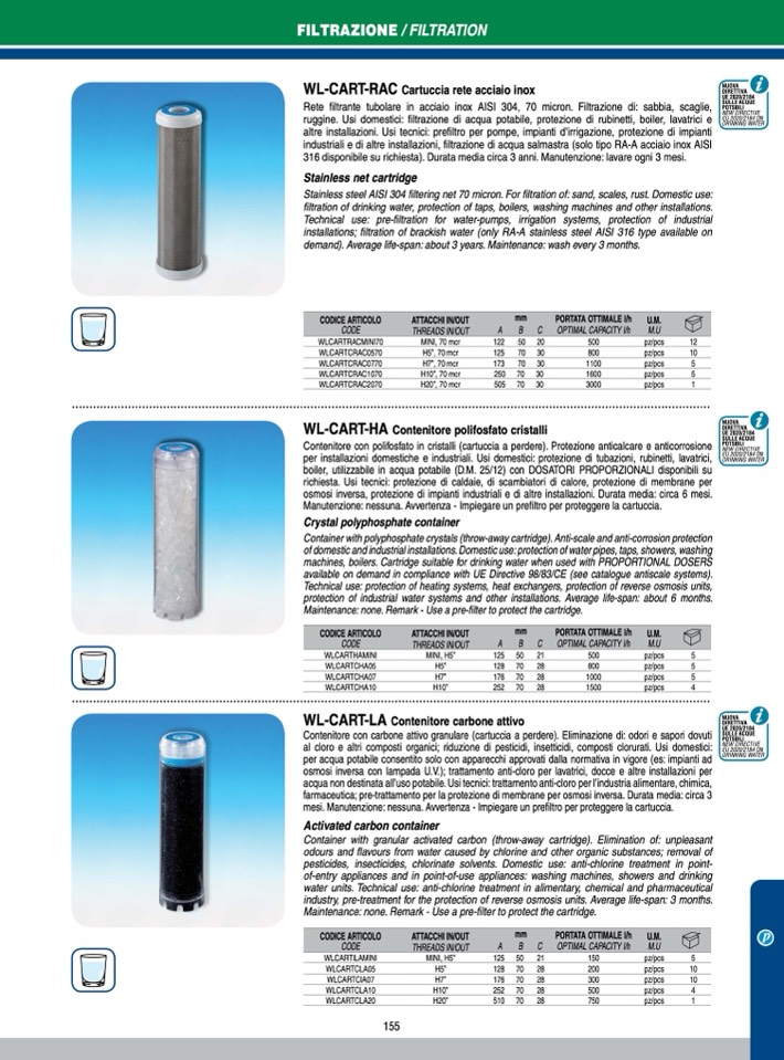 manutenzione: nessuna. Avvertenza - Impiegare un prefiltro per proteggere la cartuccia.