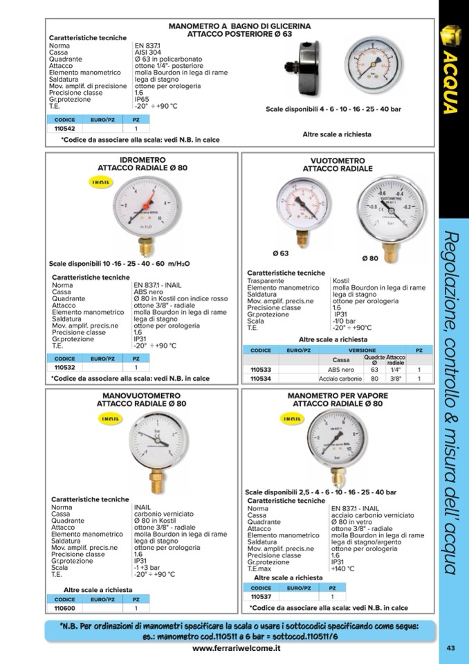 *N.B. Per ordinazioni di manometri specificare la scala o usare i sottocodici specificando come segue: