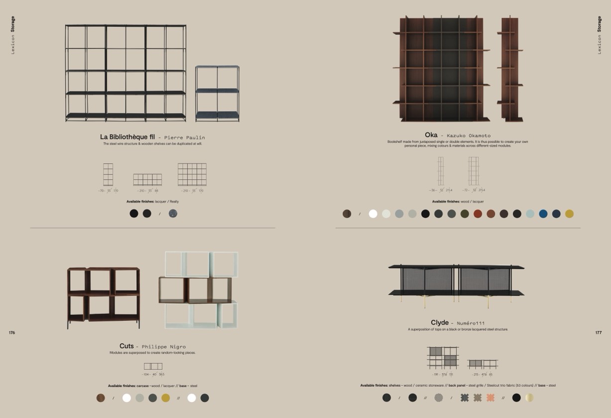 Available finishes: shelves - wood / ceramic stoneware // back panel - steel grille / Steelcut trio fabric (53 colours) // base - steel