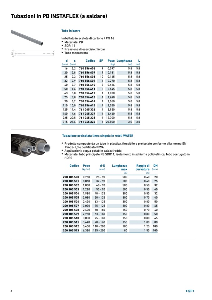Materiale: tubo principale PB SDR11, isolamento in schiuma poliolefinica, tubo corrugato in
