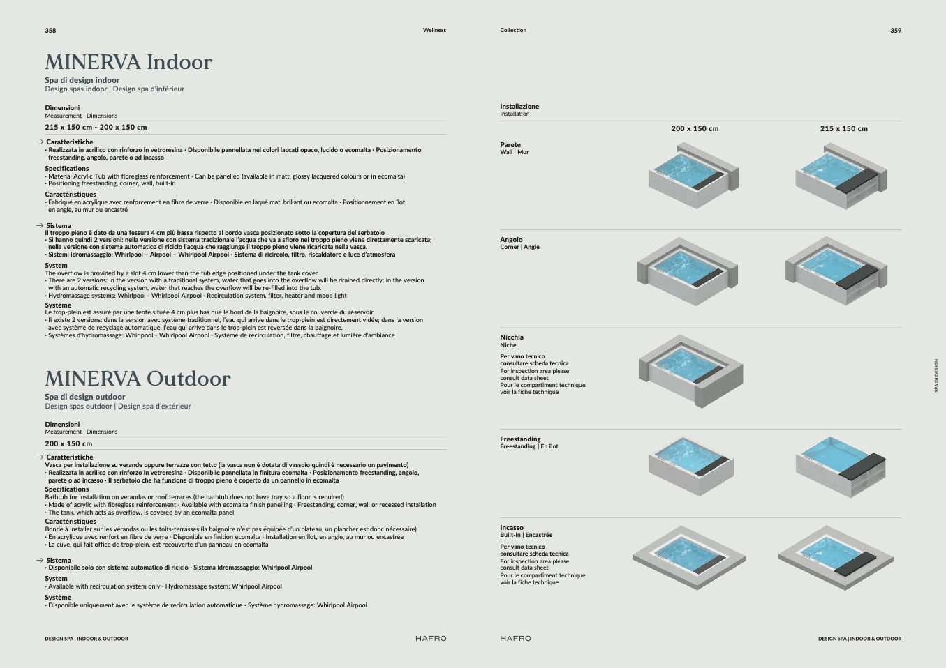 ∙ Sistemi idromassaggio: Whirlpool – Airpool – Whirlpool Airpool ∙ Sistema di ricircolo, filtro, riscaldatore e luce d’atmosfera