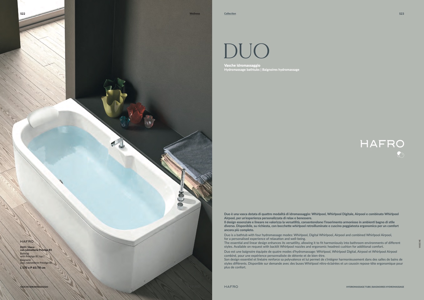 Duo is a bathtub with four hydromassage modes: Whirlpool, Digital Whirlpool, Airpool and combined Whirlpool Airpool,