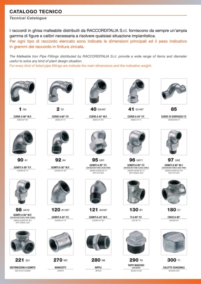 The Malleable Iron Pipe Fittings distributed by RACCORDITALIA S.r.l. provide a wide range of items and diameter