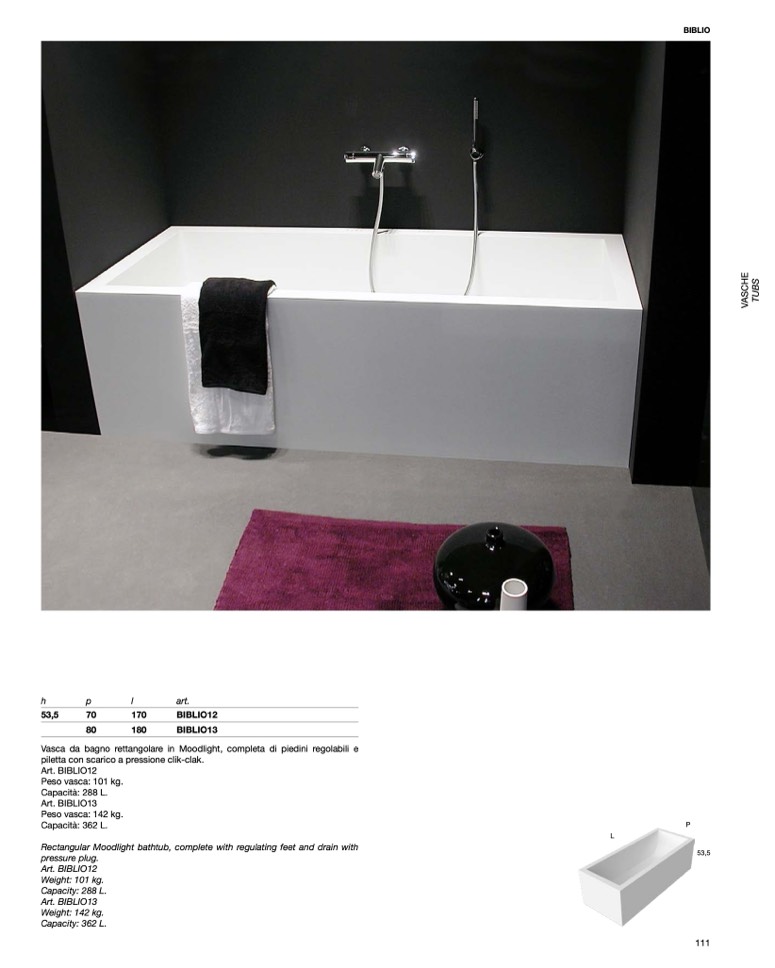 Vasca da bagno rettangolare in Moodlight, completa di piedini regolabili e