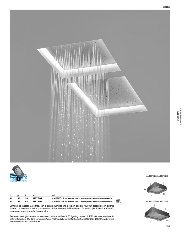 Soffione ad incasso a soffitto, con o senza illuminazione a led, in acciaio AISI 304 disponibile in diverse