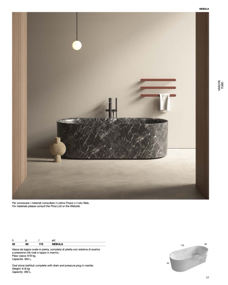 Vasca da bagno ovale in pietra, completa di piletta con sistema di scarico