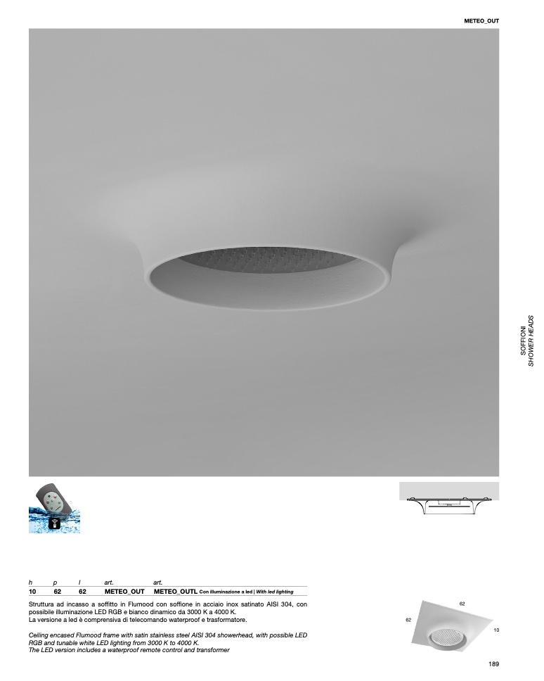 Ceiling encased Flumood frame with satin stainless steel AISI 304 showerhead, with possible LED