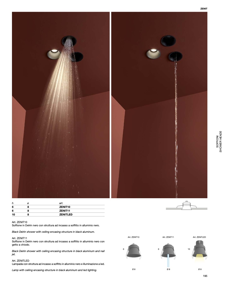 Soffione in Delrin nero con struttura ad incasso a soffitto in alluminio nero.