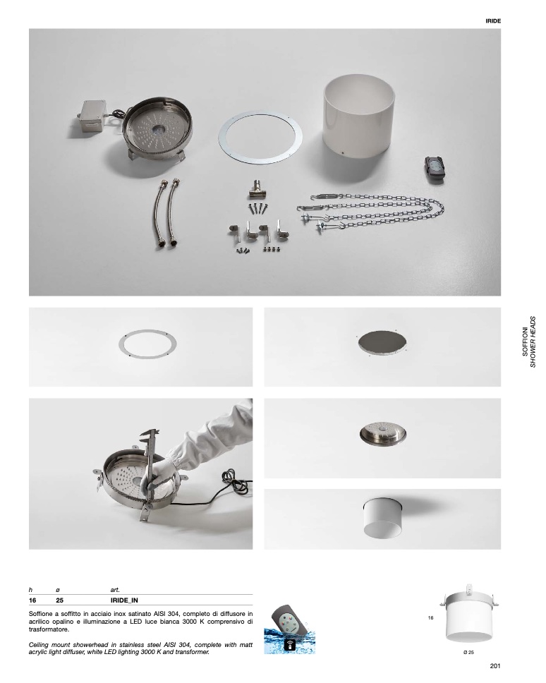 Soffione a soffitto in acciaio inox satinato AISI 304, completo di diffusore in