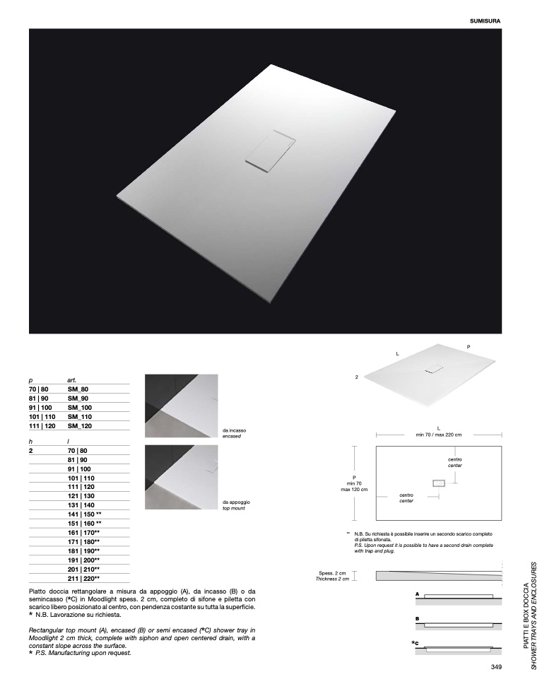 Piatto doccia rettangolare a misura da appoggio (A), da incasso (B) o da