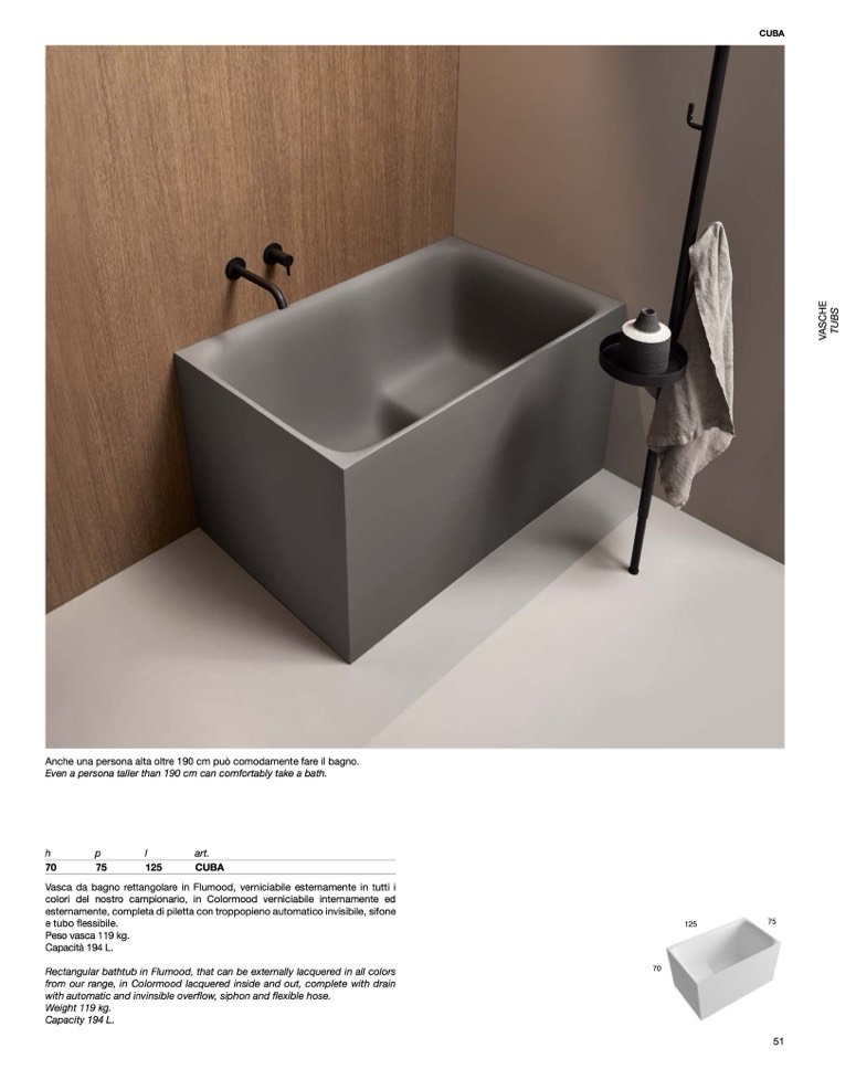 Rectangular bathtub in Flumood, that can be externally lacquered in all colors