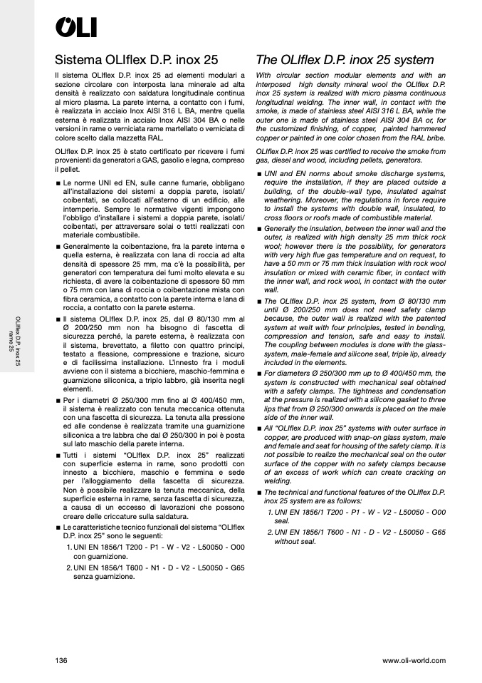 OLIflex D.P. inox 25 è stato certificato per ricevere i fumi