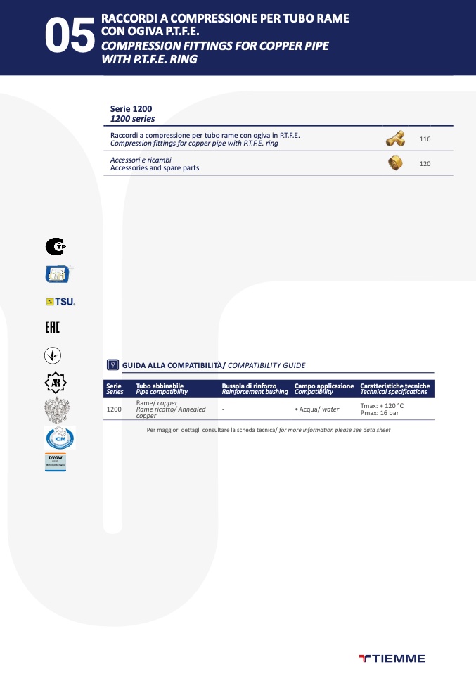 Raccordi a compressione per tubo rame con ogiva in P.T.F.E