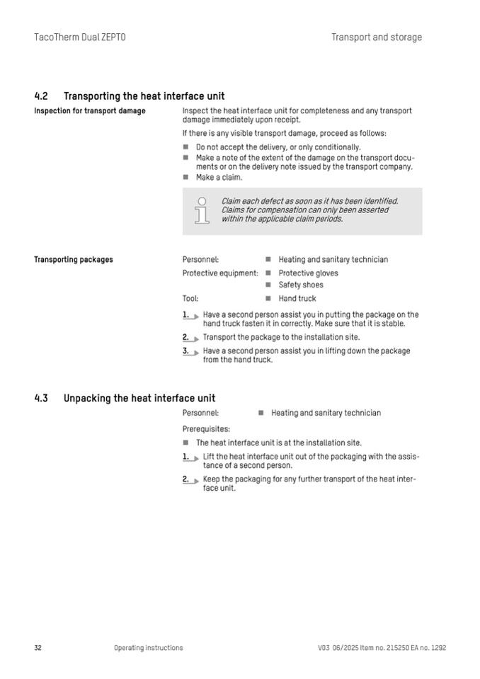 Keep the packaging for any further transport of the heat inter-