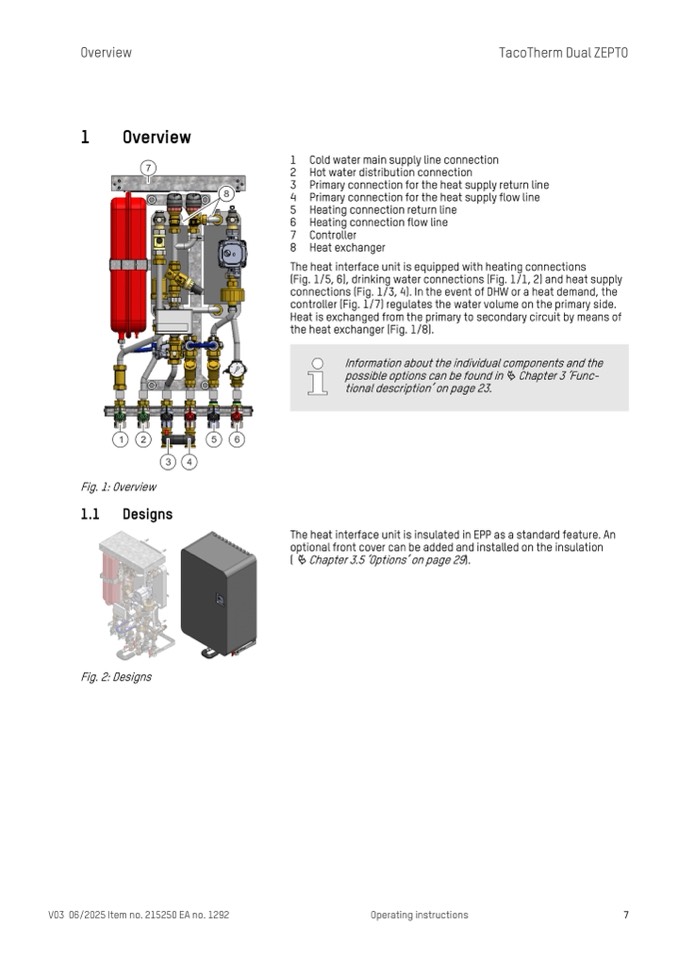 (Fig. 1/5, 6), drinking water connections (Fig. 1/1, 2) and heat supply