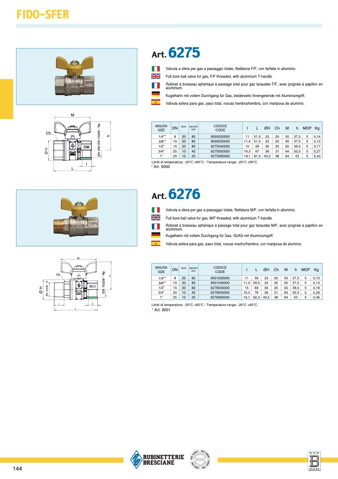 Valvola a sfera per gas a passaggio totale, filettatura F/F, con farfalla in alluminio